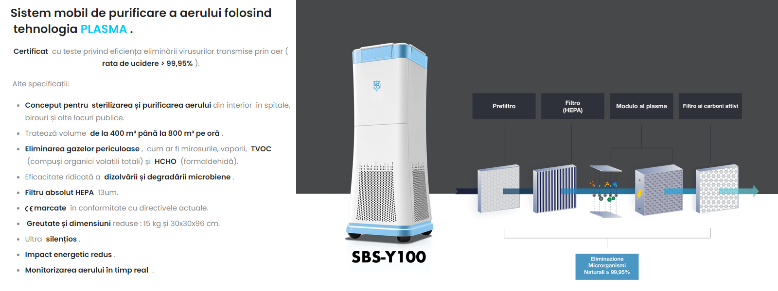 SBS-Y100 este un sistem mobil de purificare a aerului care utilizează tehnologie Plasma, certificat prin teste pentru eficiența eliminării virusurilor aeropurtate, cu o rată de neutralizare mai mare de 99,95%. Echipamentul este conceput pentru sterilizarea și purificarea aerului în spații interioare precum spitale, birouri și alte locuri publice.